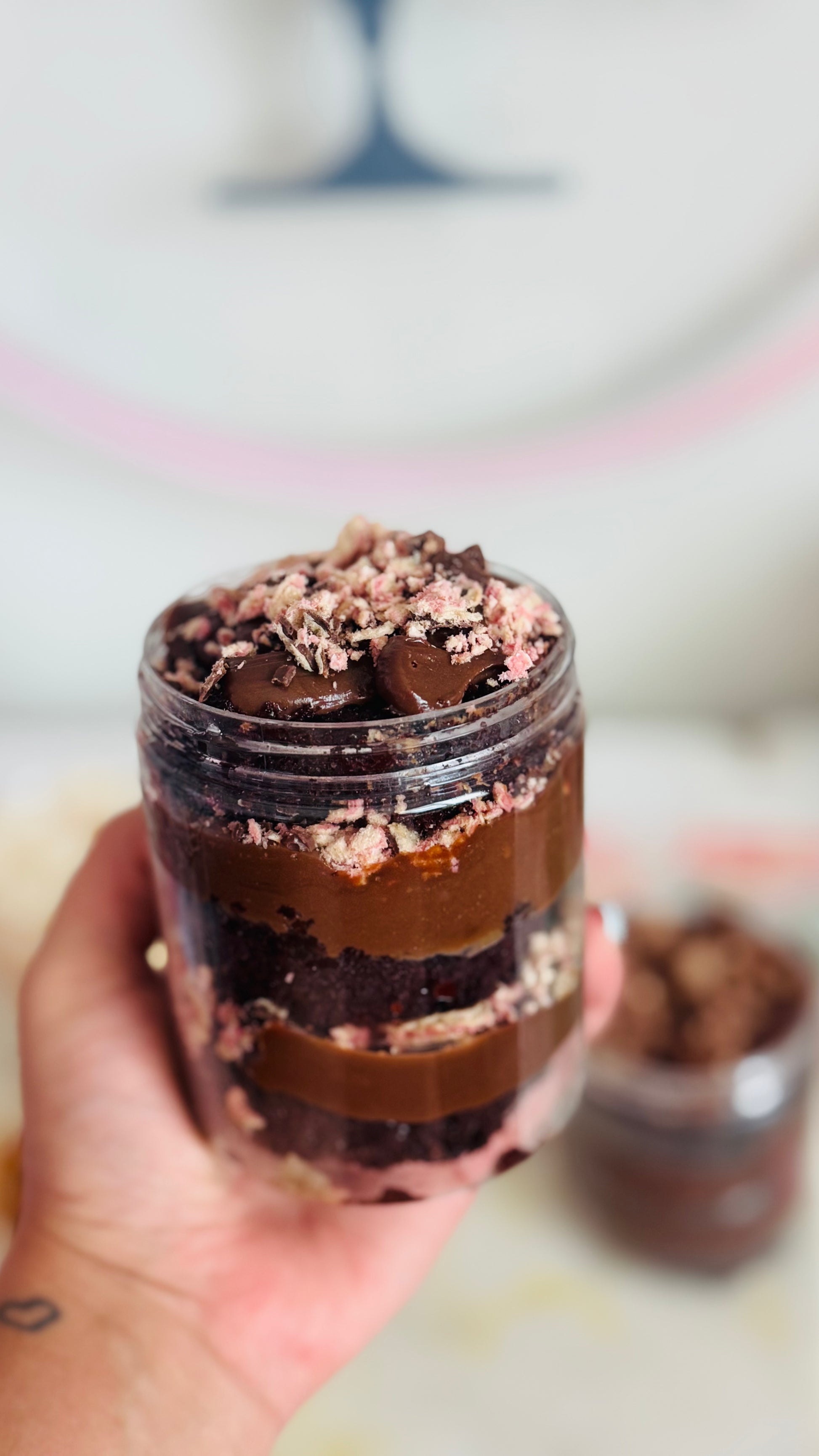 torta oscura de chocolate humedecida en almibár de cacao, rellena de chocolate margarita con leche hecho a mano, y trozos de galleta samba de fresa.